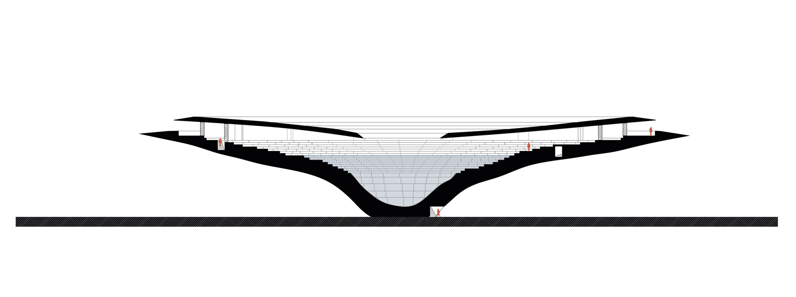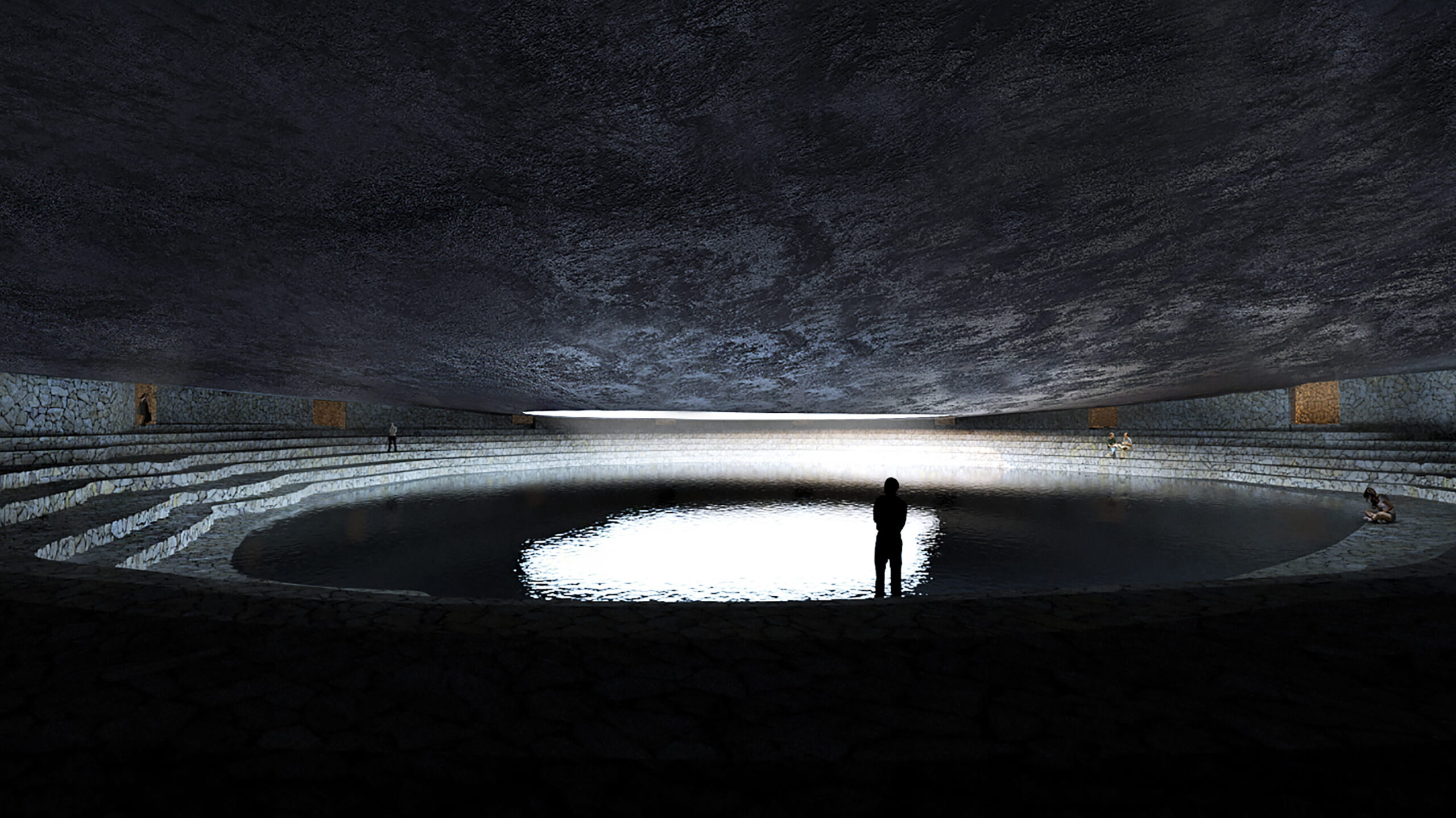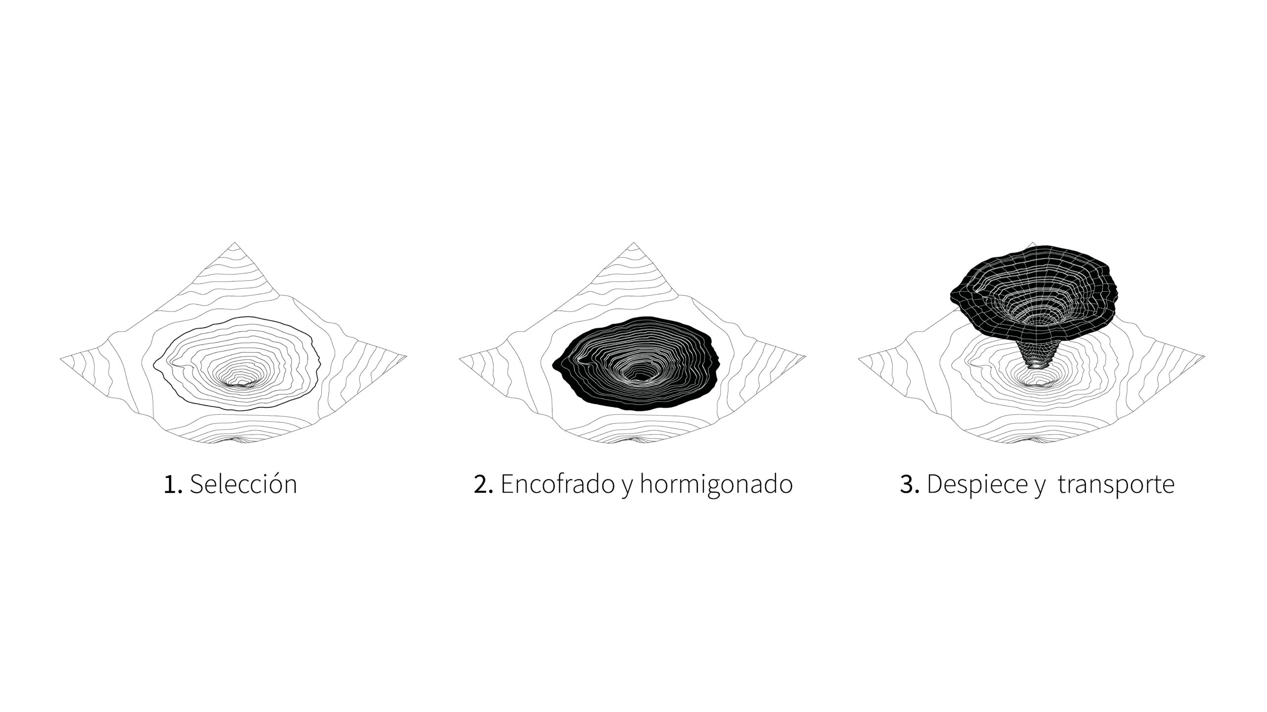 Nuestra propuesta se centra en tres ejes: La experiencia colectiva del espacio – que define la escala –, la arquitectura como infraestructura – que contribuye a la ecología – y la constitución de un memorial del presente – que construye una nueva naturaleza e interpela a sus visitantes. Utilizando como molde una depresión existente en el paisaje, se define un embudo de hormigón que, como alguna vez lo hizo el hueco que le dio forma, albergará el agua de lluvia que reciba. Luego de ser desencofrado, trasladado en partes y rearmado, sobre el encofrado perdido de piedras de su interior se montará un cinturón construido con esas mismas piedras. Éste albergará los nichos, refugios que recibirán a los habitantes transitorios del cuenco. Por encima, otro embudo similar en su construcción al primero, captará la mayor cantidad de lluvia y la protegerá de la evaporación, al mismo tiempo que oficia de techo para la experiencia colectiva de aquellos que se refugien bajo él.