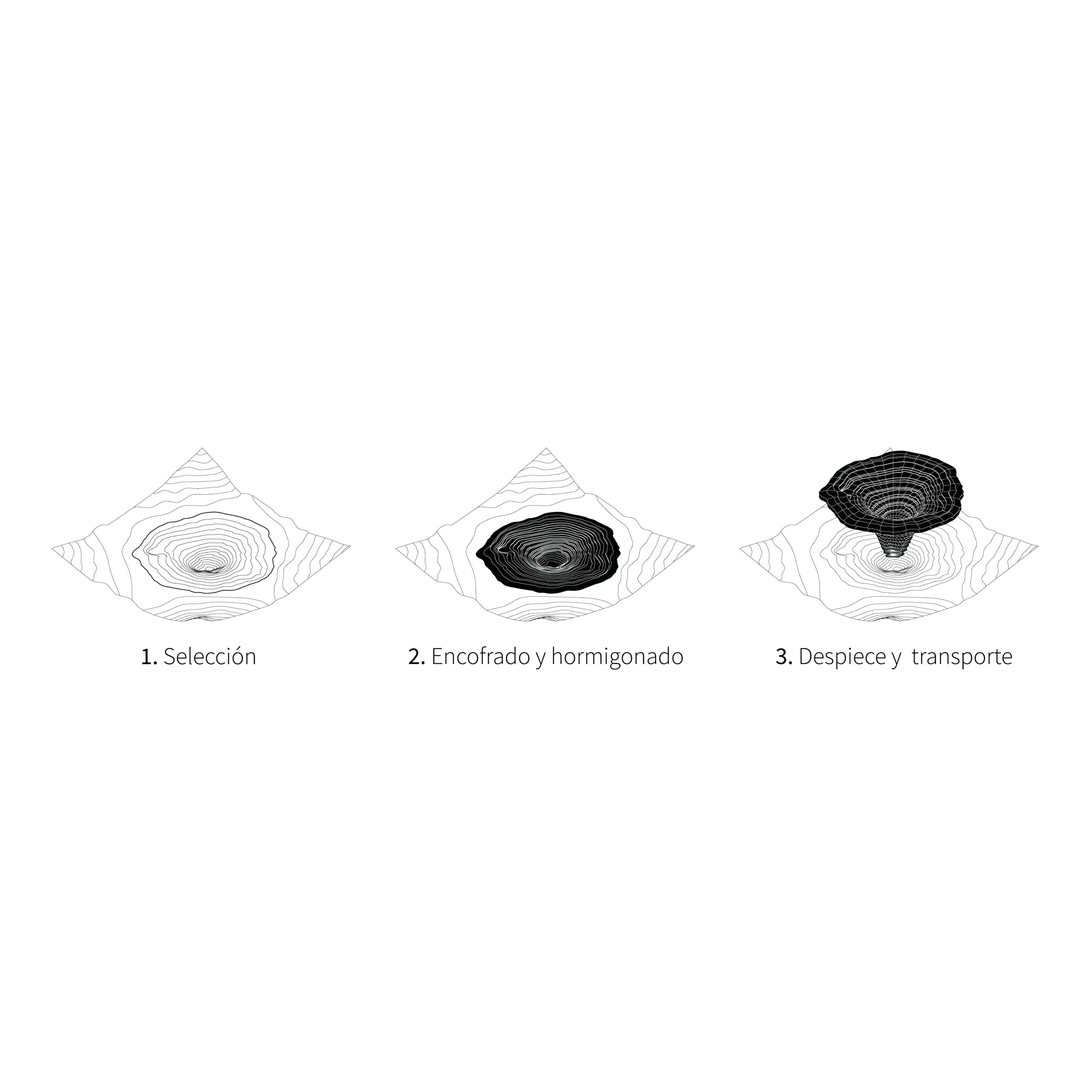 Nuestra propuesta se centra en tres ejes: La experiencia colectiva del espacio – que define la escala –, la arquitectura como infraestructura – que contribuye a la ecología – y la constitución de un memorial del presente – que construye una nueva naturaleza e interpela a sus visitantes. Utilizando como molde una depresión existente en el paisaje, se define un embudo de hormigón que, como alguna vez lo hizo el hueco que le dio forma, albergará el agua de lluvia que reciba. Luego de ser desencofrado, trasladado en partes y rearmado, sobre el encofrado perdido de piedras de su interior se montará un cinturón construido con esas mismas piedras. Éste albergará los nichos, refugios que recibirán a los habitantes transitorios del cuenco. Por encima, otro embudo similar en su construcción al primero, captará la mayor cantidad de lluvia y la protegerá de la evaporación, al mismo tiempo que oficia de techo para la experiencia colectiva de aquellos que se refugien bajo él.